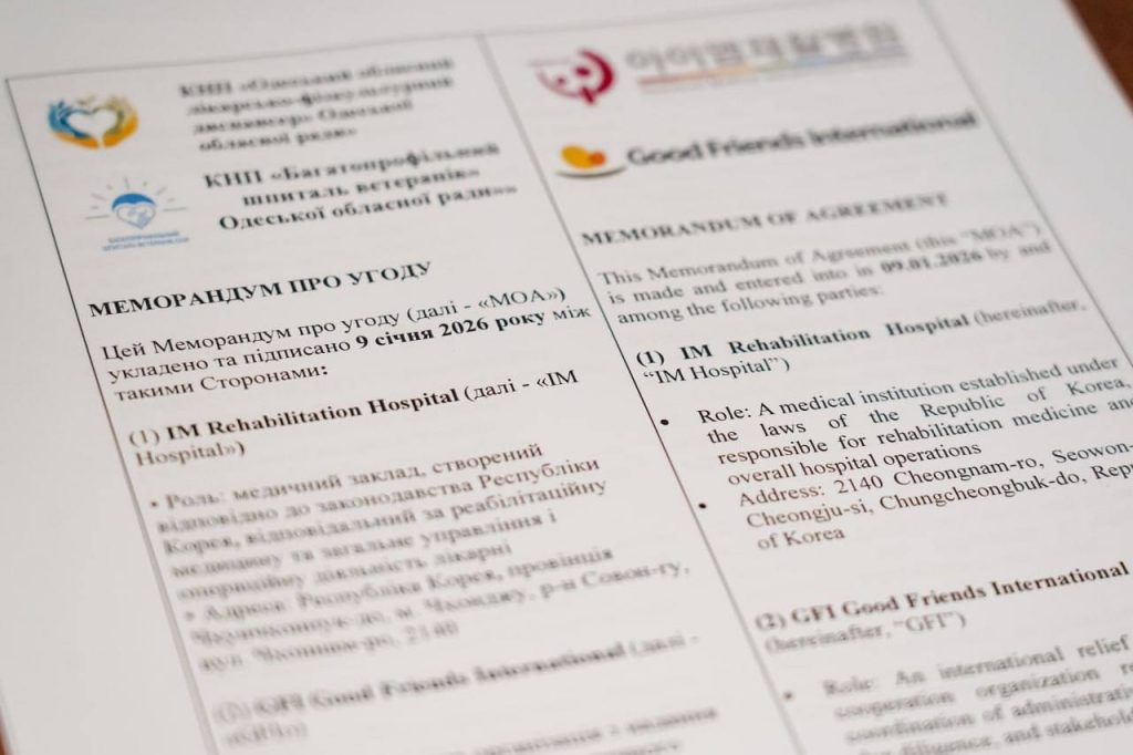 Під час зустрічі обговорили подальші кроки співпраці у сфері медичної реабілітації та підписали Меморандум про домовленість між медичними закладами Одеської області, представниками GFI та Реабілітаційною лікарнею IM (Чхонджу).